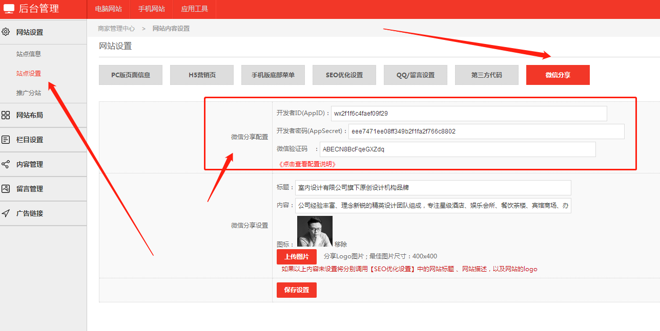 位置 網站設置 -> 站點設置 -> 微信分享 ,將以上獲得的參數對應添加保存即可。